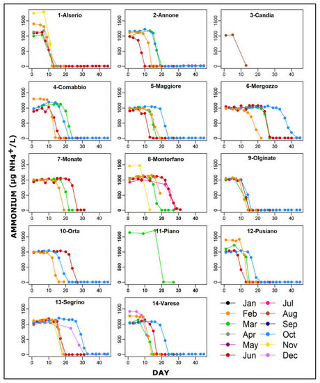 Our research highlighted an important role of the initial acclimation in the determination of the time needed to oxidize all ammonium, as the range of the D25 parameter was quite large compared to the range of days elapsed from D25 to D95. Once it began, the ammonium oxidation rate was significantly and positively affected by the natural content of ammonium in the lakes, as highlighted by the second GLM model [12,62,68].