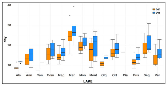 D95 showed a mean value among the lakes of 17.9 ± 0.8 days. The various lakes showed a difference in this parameter, with a mean value of 12.8 ± 1.3 days for L. Alserio, 14.6 ± 2.2 days for L. Annone, 13.8 days for L. Candia, 17.7 ± 2.2 days for L. Comabbio, 16.8 ± 2.2 days for L. Maggiore, 27.8 ± 4.1 days for L. Mergozzo, 21.7 ± 2.2 days for L. Monate, 19.7 ± 2.4 days for L. Montorfano, 13.7 ± 0.5 days for L. Olginate, 20.6 ± 2.8 days for L. Orta, 20.5 days for L. Piano, 14.3 ± 1.7 days for L. Pusiano, 20.4 ± 2.2 days for L. Segrino, 16.5 ± 1.7 days for L. Varese (Figure 3). The lakes that showed the higher value of D95 were L. Mergozzo, L. Monate; instead L. Alserio, and L. Olginate displayed the lower values, similar to that detected for D25. The results were similar to that detected for D25 and a Spearman’s correlation analysis highlighted a strong relationship (ρ = 0.98, p < 0.001) between D25 and D95.