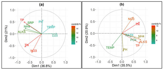 Loadings plots of the first two components of the principal component analysis (PCA) with different colors according to the parameters contributions (“contrib %”) performed on 8 chemico-physical parameters and (a) number of days elapsed from the beginning of the experimental procedure until an ammonium concentration decrease equal to the 25% (D25); and, (b) oxidation rate of ammonium (OxRate). See “Materials and Methods” for abbreviations.