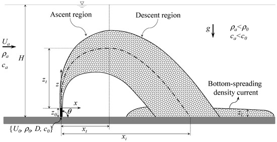 An inclined dense jet discharged into a flowing current [19,29,30] can almost be characterized by two distinct phases: (i) a rapid ascent phase; and (ii) a gradually descent phase [18]. During the ascent phase, the jet behaves as a momentum pure jet discharged into a crossflow. With a small value of ur, the jet is only weakly affected near the exit, penetrating uprightly into the crossflow before bending over. During the descent phase, the jet changes to a kind of negatively buoyant jet/plume; its velocity significantly reduces, the downward buoyant forces cause the discharge to gradually fall back and its trajectory impacts the bottom at a downstream distance xi. Near the bottom, the discharge laterally spreads in all directions, forming a bottom layer of spreading density current of thickness zL.