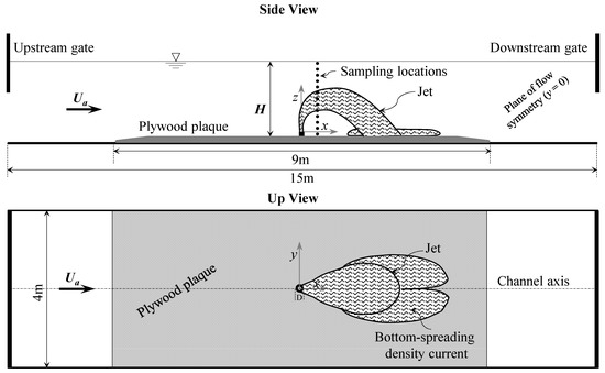 Using a three-dimensional laser-induced fluorescence (3DLIF), Gungor and Roberts [19] carried out a series of laboratory experiments on the dilution of vertical dense jets in a flowing current. The investigators observed that the jet reveals very complex flows, spatially varying and depend on the current speeds urF, where ur is the ratio of ambient to jet velocity and F is the jet densimetric Froude number. These complex phenomena make the jet difficult to numerically manage. Thanks to the extensive jet-concentration measurements, the authors obtained a detailed three-dimensional picture of the jet structure within the surrounding environmental flow. They indicated that, at low speeds (urF < 0.5), the jet descending flow is strongly asymmetric and of complex hydrodynamic structure, experiencing a sharp curvature at its terminal rise height. At urF = 0.9, a slight asymmetry occurs in the ascending region, whereas, an almost vertical symmetry of the jet was observed in the descending region. Recently, Ben Meftah et al. [18], analyzing the same data of the present study but focusing on the vortical structure of the jet, definitely confirmed the formation of counter-rotating vortex pair (CRVP) through both the ascending and descending jet regions, a topic of conjecture in many previous studies without any experimental demonstration.