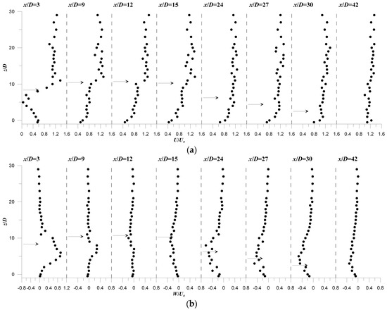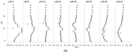 Unlike the streamwise velocity component, the W/Ua-profiles are differently developed over the flow depth. They always experience a single peak below the jet axis. In the ascending region, W/Ua shows positive values which gradually decrease as going further away from the jet source, similar to what happens with momentum jets in crossflows [14,39]. At the downstream distance xt (Figure 2), where the jet flow practically becomes horizontal, W/Ua significantly reduces. In the descending region, W/Ua shows negative values, indicating that the jet bends downward.