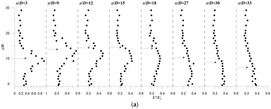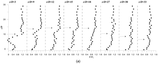 This finding is in good agreement with results obtained by Ben Meftah et al. [14] and Sherif and Pletcher [39] for momentum jets in crossflow. This suggests that, in the ascending region, the jet is primarily driven by momentum flux, behaving like a vertical non-buoyant jet in crossflow [5,14,39]. The velocity profiles in Figure 4a and Figure 5a show that the absolute maximum of U/Ua, in the jet flow-field, always appears slightly above the jet axis. The magnitudes of both maxima gradually decrease as x/D increases, as clearly shown by the profiles of run R2. In the wake region, close to the jet source, the jet velocity U/Ua experiences very small and negative values. At x/D = 3, as an example, U/Ua ≈ 0.05 and −0.1 with R1 and R2, respectively. This confirms the wake vortices formation at the inner part of the jet, as also mentioned in the previous study by Fric and Roshko [40]. For all the profiles at any position x/D, U/Ua shows an almost constant value of order 1.2Ua, over the flow depth starting from the jet outer-boundary up to the free-surface flow. These results are in complete agreement with those obtained by Ben Meftah et al. [14] and Sherif and Pletcher [39], reflecting simply the vertical distribution of U/Ua in the ambient current without the jet effects. In the descending region, the two velocity-maxima are less pronounced, and the U/Ua-profiles, at x/D > 30, resemble a classical vertical profile of mean velocity in an open channel flow.