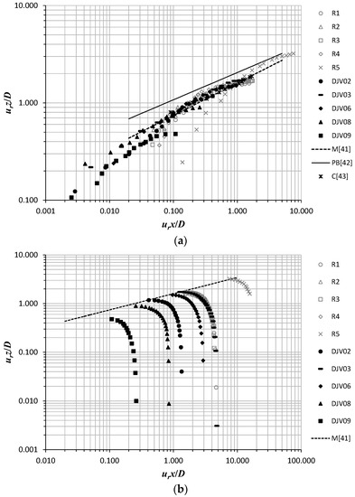 Figure 6 shows the jet trajectories of runs R1 to R5 scaled with D/ur and plotted in log-log scales. It is important to note here that these trajectories refer to the jet axis, as above defined. In addition to the data of the present study, the jet centerlines (as above defined) obtained by Gungor and Roberts [19] for a dense jet of five different values of urF are also plotted. On Figure 6 we also plot some predicted and experimental trajectories obtained in previous studies [41,42,43] for momentum jets.