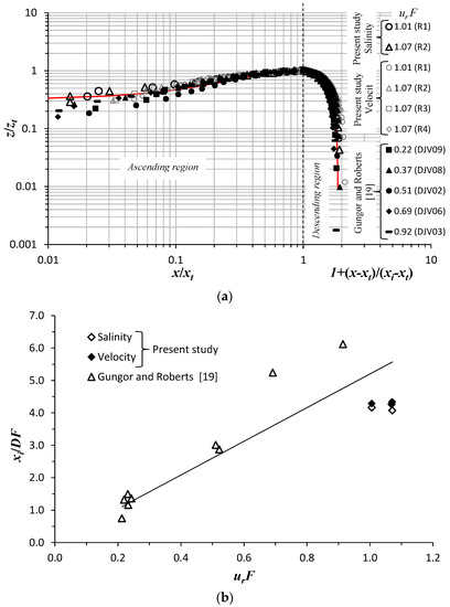 At urF < 2, it was observed that the dense jet is characterized by an ascending and a descending regions [14,19] and its trajectory is fundamentally described by three characteristic length scales (Figure 2) xi, xt and zt (Table 1). In the present study, we will try to rescale the jet trajectory as z/zt vs. x/xt, in the ascending region, and z/zt vs. [1 + (x − xt)/(xi − xt)], in the descending region. Figure 7a illustrates both the rescaled jet axis, for all the experimental runs illustrated in Table 1 of the present study (except that of run R5 at urF > 2, where the jet undergoes rapid dispersion by the effect of the ambient flow-turbulence), and the jet centerline for runs R1 and R2. The results of the present study are also compared to the centerline trajectories obtained by Gungor and Roberts [19]. Figure 7a clearly shows that all the jet trajectories (axis and centerline), of the present study and those of Gungor and Roberts [19], perfectly collapse onto a single profile. In the ascending region, at x/xt < 0.03, it can be noted a slight data scattering, due to the effect of the potential core region of the jet. The rescaling of the jet trajectories by xt, xi and zt leads to a typical trajectory for all experiments with complete independence of urF (ranging almost between 0.2 and 1.1 in the present study). This typical trajectory is predictable by the following proposed closed-form expression: