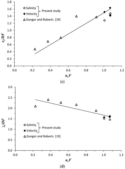 Figure 6b also indicates that the maximum rise height (ending and beginning of the ascending and descending regions, respectively) of the jet trajectories appeared at different longitudinal and vertical coordinates. This points out that, despite the collapse of the jet trajectories in Figure 6a onto an almost single curve, the scaled profiles in the ascending region, really, suffer an incomplete similarity. Therefore, the application of a power-law as proposed by Margason [41] can simply predict the tendency of the jet trajectory in the ascending region, but not the exact profile. The incomplete similarity between the jet trajectories, following the scaling mode proposed for momentum jets, makes us think of another compatible scaling rule. In a recent study, Gungor and Roberts [19] suggested that, based on dimensional analysis of the initial characteristic physical properties of a dense jet, the jet trajectory coordinates could be scaled by DF. Nevertheless, the authors observed that the scaling of the jet trajectories by DF leads to one “universal” trajectory for only experiments that have the same values of urF, as also observed in Figure 6b scaling the jet trajectory by D/ur. Once again, it can be noted that the scaling of the jet trajectories by DF is also not appropriate to represent the trajectories of different urF-values by a typical profile.