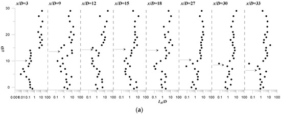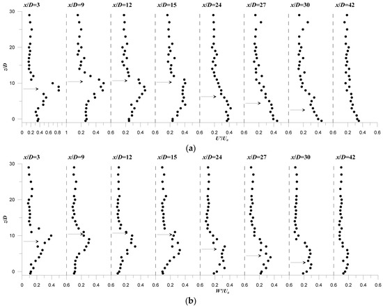 Vertical profiles of the flow turbulence intensity at different downstream positions x/D along the plane of flow symmetry (y = 0) of run R1: (a) U’/Ua; (b) W’/Ua. The horizontal arrow on the profiles indicate the position of the jet axis.