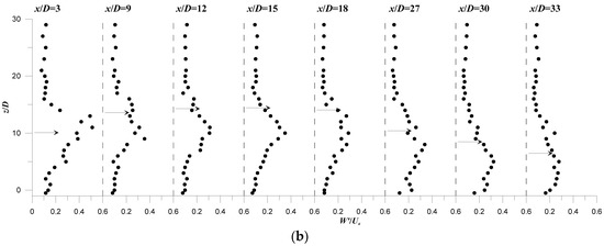 Figure 8b and Figure 9b show that the highest values of W’/Ua take place in the jet flow-field. W’/Ua also shows an absolute peak below the jet axis. In the ascending region, W’/Ua decreases as x/D increases, attains minimum values at the maximum rise height position, as shown at x/D = 9 and 12, and then starts to slightly increase in the descending region with the increase of x/D. Outside the jet flow-field, independently of x/D, W’/Ua for both runs R1 and R2 shows almost constant values of O(0.10) over the flow depth.