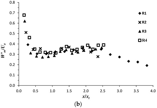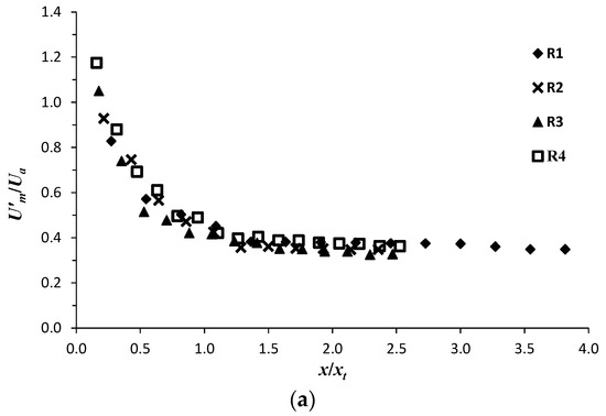 In order to get more information on the jet-turbulence-intensity behavior, an analysis of the maximum-turbulence-intensity decay/rise as a function of the downstream distance from the jet exit is examined for runs R1 to R4. Figure 10a,b show, respectively, a plot of U’m/Ua and W’m/Ua against x/xt, where the subscribed m indicates the maximum value of U’/Ua and W’/Ua on the vertical profiles of Figure 8 and Figure 9. Figure 10a shows that, for all runs, U’m/Ua continuously decays as a function of x/xt, regardless its appearance in the ascending (x ≤ xt) or in the descending regions (x ≥ xt). Figure 10a indicates that U’m/Ua decays more rapidly in the ascending region than in the descending region. As going further downstream, the decrease-rate of U’m/Ua as a function of x/xt significantly reduces.