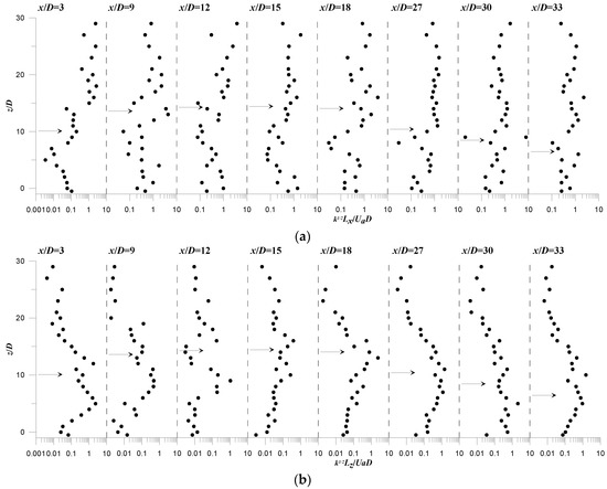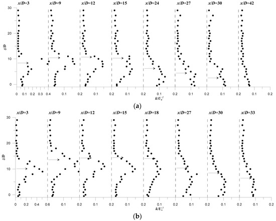 Vertical profiles of the normalized time-averaged turbulent kinetic energy at different downstream positions x/D: (a) run R1; (b) run R2. The horizontal arrows on the profiles indicate the position of the jet axis.