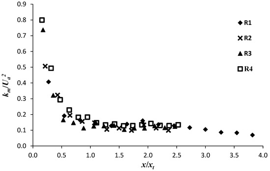 Decay of the maximum turbulent kinetic energy k/Ua2 as a function of x/xt.