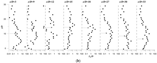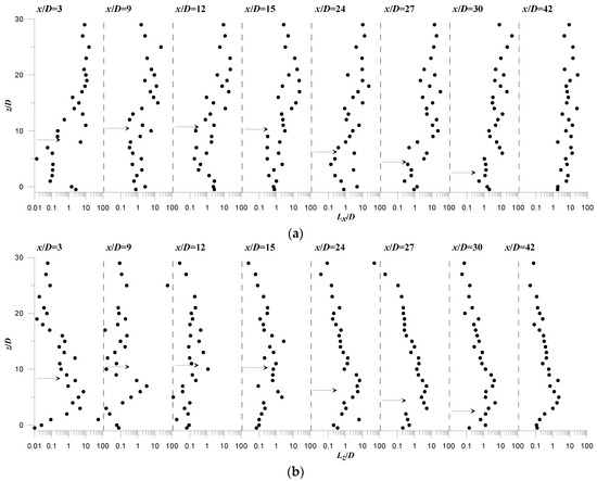 Vertical profiles of the normalized turbulent length scales at different downstream positions x/D at the plane of flow symmetry (y = 0) of run R1: (a) Lx/D; (b) Lz/D. The horizontal arrow on the profiles indicate the position of the jet axis.