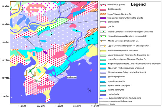 - Bureau of Geology and Mineral Resources of Guangdong Province (Guangdong, B.G.M.R.). Regional Geology of Guangdong Province; Geology Publishing House: Beijing, China, 1988; pp. 1–602. (In Chinese)
