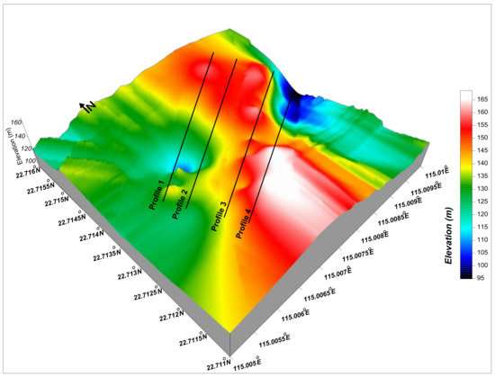 The simplified geological settings of the study area are given in the hydrogeological map as shown in Figure 2. Based on the geological settings, the investigated area is composed of volcanic and magmatic rocks/minerals of Jurassic age such as volcano dust, matrix, quartz, pyrite sulfide, feldspar, pyroxene, and basalts with some quartz veins embedded in the Aeolian tuff rock [41]. Various factors control the groundwater potential, occurrence and its flow in the study area such as hydrothermal processes, tectonic forces associated with weathering, fracturing, and fissuring, and secondary alteration of veins that contains high concentration of structural, lithological, and compositional heterogeneities that cause the water circulation [41]. The weathering processes play a major role to facilitate the water infiltration and its transportation in the top surface layer. Hydrogeologically, the weathering assists to make up the crucial period for the occurrence of groundwater reserves [42]. In the investigated area, the main aquifer is found in the upper layer formed by weathering, fissuring, and fracturing. Several boreholes were conducted in this investigation to reveal the existence of weathering, fissuring, and fracturing in the subsurface formation. Generally, the water level varies from 2 m to 32 m below the top surface, and from 106 m to 148 m with the elevation. In addition to above factors, various faults, the dynamo metamorphic zone and an unconformable boundary make the hydrogeological conditions more complex in the area to study the groundwater potential in hard rock aquifer (Figure 2). The topographic variations in the study area are shown in Figure 3. Electrical resistivity tomography (ERT) survey integrated by borehole, JPM and magnetic method was conducted in Huidong area by a joint project of University of Chinese Academy of Sciences, Institute of Geology and Geophysics to assess the subsurface hydrogeological conditions for groundwater potential. Figure 1 shows the location of the study area with the measurements of ERT, JPM, magnetic and borehole data.