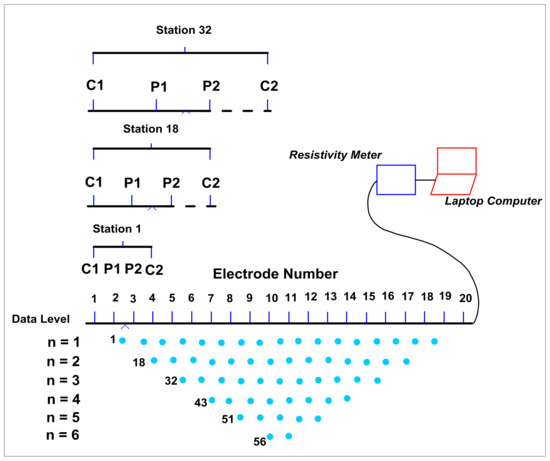 In this survey, ERT method with ABEM Lund Imaging System (Lund University, Lund, Sweden) [16] was applied using different layouts. This is an automated imaging system for the collection, processing, and presentation of resistivity. This method is based on the conductivity difference between the rock formation and the surrounding materials. By studying the underground steady electric field, this method is a very useful exploration tool to solve the engineering hydrogeological problems. The resistivity imaging is a recently developed modern technique to investigate the subsurface characteristics of the areas with complex geological settings where the applications of other methods such as resistivity soundings are not affective [43]. This method is defined by the density, the arrangement of electrodes and the amount of information to be acquired. ERT provides the subsurface geologic information through the corresponding interpretation using a software. An example for the principle of building up a resistivity pseudo-section using ABEM Terrameter with a system of 20 electrodes for pole-dipole array is given in Figure 4. It is a multi-function electrical instrument that has a multi-electrode convertor for the observations. Electrical resistivity tomography (ERT) is cost effective, fast, and versatile technique for mapping the groundwater conditions and assessing the shallow subsurface anomalies [44]. This technique is useful to obtain the important information for the planning of groundwater exploration. By increasing the electrode spacing, it can measure a series of constant separation traverses. Since increasing the separation provides more depth penetration, the vertical contoured image of measured apparent resistivity shows lateral and vertical variations in apparent resistivity over the section. The important geological units such as weathered/partly weathered/fissured layers, fractures and faults associated with the groundwater occurrence in the area were the main targets under this investigation. Different rock types (weathered rocks, partly weathered rocks, unweathered rocks), fractures, fissures, streams, or springs in the surroundings were considered as important aspects in selecting the locations for the resistivity lines. It was also very important to get the useful geological information in situ by drilling the boreholes. The slurry hole-boring method was used for drilling without using any metallic casing in this investigation.