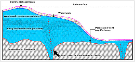 Conceptual model of hydrogeological properties in weathered basement rock (modified after [54]).