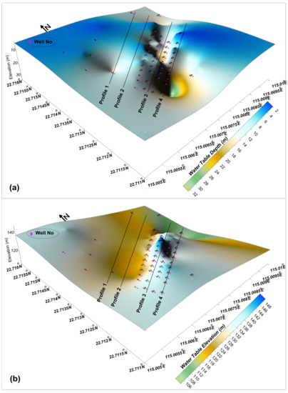 Water table in the study areawith respect to (a) depth and (b) elevation.