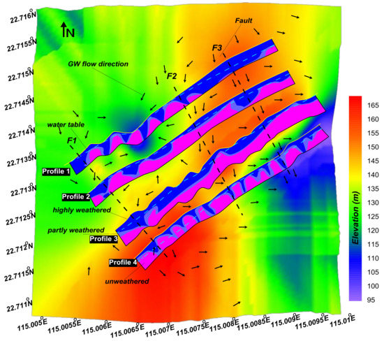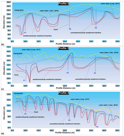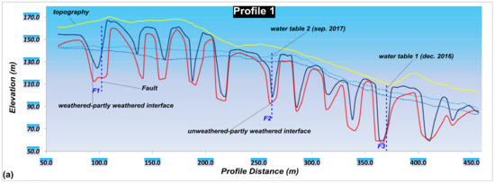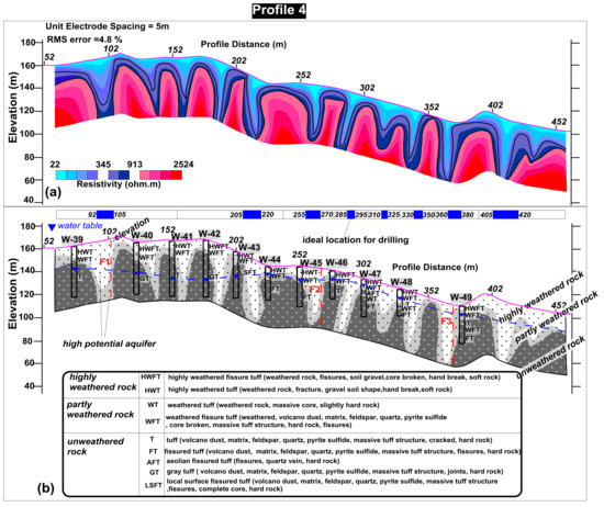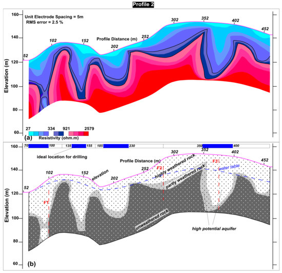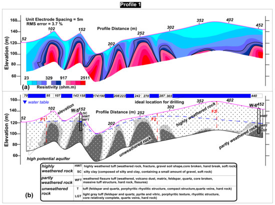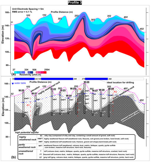 The imaging method encountered three distinct layers namely highly weathered rock, partly weathered rock, and the fresh bedrock along the profile 1 as shown in Figure 8. The top distinct layer is highly weathered layer with an average thickness of 20 m, and it contains weathered tuff rock, silt and clay and other weathered materials with resistivity ranging from 23 Ωm to 329 Ωm. The top layer extends to the partly weathered layer which is 10 m thick and its resistivity ranges from 329 Ωm to 917 Ωm mainly composed of weathered fissure tuff rock with volcano dust, matrix, feldspar, quartz etc. Fresh basement rock is encountered under the partly weathered layer at an average depth of 20 m with resistivity values ranging from 917 Ωm to 2511 Ωm. The bedrock contains unweathered tuff rock mainly consisted of feldspar, quartz, pyrite etc. Groundwater in the Basement Complex is generally found in the weathered, fractured, fissured, and jointed systems of the bedrock [55]. The low resistive layers indicate the presence of water. Highly weathered and partly weathered layers are the most promising water-bearing layers in the study area. Figure 8 shows the interpreted resistivity section of three distinct layers with the borehole information along profile 1. Three main faults (F1, F2 and F3) were identified along this profile in northeast to southwest (South China Sea) direction. The suitable locations for drilling were marked by the horizontal thick blue line as shown in Figure 8b. The conditioning of groundwater is the thickness of the aquifer layer and Figure 8 shows good locations to drill a borehole, for instance at 70 m to 95 m, 107 m to 143 m, 158 m to 174 m, 190 m to 208 m, 223 m to 242 m, 270 m to 287 m and 303 m to 440 m.