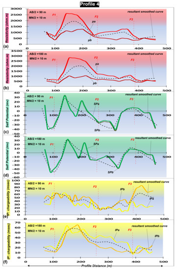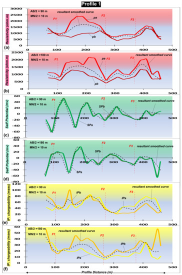Using JPM, the resistivity, SP and IP composite joint curves were plotted at 90 m and 180 m depths to observe the alterations in the curves along the main faults as shown in Figure 9. Magnetic data was also plotted to see the variations in magnetic values along the identified faults (Figure 14a). The resistivity, SP, IP, and magnetic curves show clear alterations along the main faults integrated by ERT.