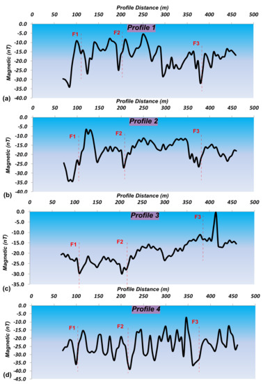 Graphical plots of magnetic data along (a) profile 1, (b) profile 2, (c) profile 3 and (d) profile 4.
