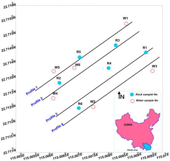 Water samples were collected from six different places in the investigated area as shown in Figure 15. Two (sample No. 1 and 2) of these six samples were collected from the fissure water (from bore-wells at an average depth of 40 m to 50 m) and other four samples (sample No. 3, 4, 5 and 6) were taken from the water channels. Water samples were collected using 500 mL plastic bottles of mineral water at noon. After the bottles were filled with water, bottle caps were tightened and sealed to avoid contamination. Before sample collection, the bottles were rinsed three to five times with water filtered through 0.5 mm mixed cellulose ester membrane. The samples were preserved at approximately 4 °C before the analysis. The water samples were analyzed as per standard procedure [56,57,58] for physicochemical parameters such as sodium (Na+),potassium (K+), calcium (Ca2+), magnesium (Mg2+), bicarbonate (HCO3−), chloride (Cl−), sulfate (SO42−), ammonium (NH4+), nitrate (NO3−), pH, electrical conductivity (EC) and total dissolved solids (TDS) in the Guangdong Geological Experimental Testing Center. The international standard referential materials and the synthetic solutions were applied to the samples in order to verify the accuracy. The physicochemical parameters were calculated using mean values. For the standard referential materials, recovery was found greater than 95%. To check the data quality, the charge balance for each water sample was determined and charge balance error for each analysis was found to be <±5% which is acceptable as shown in Table 3. The major element compositions of the samples were all lower than the guideline values for drinking water of the World Health Organization (WHO). However, we are not able to comment on the suitability of the waters for drinking in the absence of data on trace elements, organic constituents or pathogens. The pH values of six water samples are more than 7, so all of them are alkaline. However, the pH values of two samples (fissure water) are above 7.5, which are more alkaline than other four samples. pH values of four samples (water channels) are low probably due to the faster water channels flow and greater contact area with air than the fissure water, dissolving more CO2.