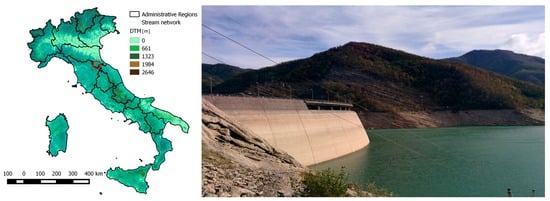 The test case study area is located in the Emilia Romagna Region, Central Italy. The red circle identifies the location of the area, left panel. The experiment is performed at the Ridracoli lake, artificially created by the construction of the homonymous dam, right panel.