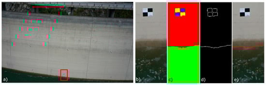 The drone is flown above the water in the reservoir of the dam. The water level was estimated at four different locations to test the goodness of the procedure, see Figure 2. The frames used to estimate the water level values are the images shot at the upstream face, where eight free spillway gates open to allow for the overflow of the dam, Figure 3a. It is interesting to note that there is a light grey shade on the dam surface due to the preexisting water level into the reservoir, Figure 3b. Therefore, it is necessary to pay attention to the identification of the water level to be accurate. The water line can be described as the demarcation line between the water and everything else that is above water. The procedure to determine the water level value encompasses the following steps. First, to define the water demarcation line, the image pixels are categorized in four different classes (i.e., water, concrete face, white and black parts of the marker), Figure 3c. To distinguish pixels, a feature selection approach is used as also described in Marx et al. []. The free and open-source project Interactive Learning and Segmentation Tool Kit (Ilastik v.1.1.3; []) is used for pixel-wise classification. The image features are computed from the characteristics of the neighborhood of each pixel, including edge indicators as well as color and texture. The feature selection procedure aims at finding and disregarding anomalous edges, such as lines due to change in concrete color, ashlars, etc. Once the pixels have been classified, the edge detection operation is performed by means of the Canny method [], Figure 3d. The Canny method finds edges by looking for local maxima of the gradient of the gray scale. The edge function calculates the gradient using the derivative of a Gaussian filter. This method uses two thresholds to detect strong and weak edges. By using two thresholds, the Canny method filters out the noise more than the other methods, and it can easily detect true weak edges. The minimum and maximum threshold values are equal to 0.019 and 0.047, respectively. GCP and water level edges are thus identified, Figure 3e. Then, the water level line in pixel coordinates is calibrated to real-world coordinates using, as a benchmark, the center of each one of the four GCPs. The water level retrieved from the images shot by the sensing platform is then compared with the benchmark value. The benchmark is obtained from a spring balance, which measures the weight of the water column and returns the corresponding water level of the lake. The wind speed at the time of the airborne flight generated a mild surface waviness, allowing us to also test the procedure in adverse meteorological conditions.