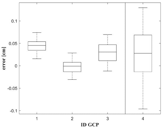Boxplot of errors between estimated and observed water level values at the four Ground Control Points (GCPs).