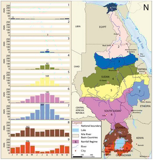 Rainfall regimes over the Nile basin. Base period is from 1961 to 1990. Image modified from [], data from [].