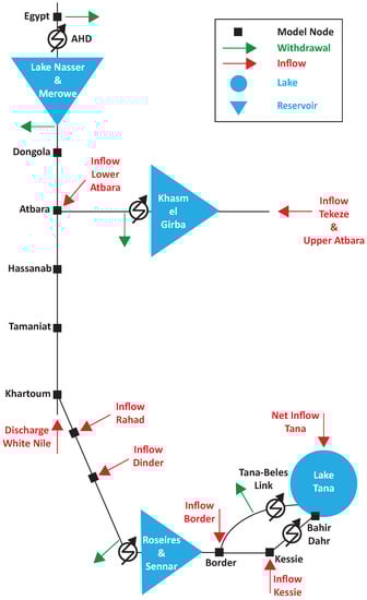 Indeed, the Nile system case selected to test the approach is one of the most studied [,,,,,] and is definitely interesting under many perspectives: It is still widely discussed for its physical extension, socio-economic relevance and political implications [,,,,,].