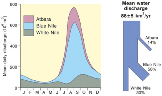 The flow regime of the Nile showing the typical contribution of the three main tributary basins. White Nile is almost constant throughout the year. Figure from [] based on data from [,].
