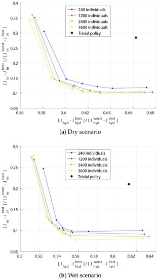 Starting from the two groups of Equations (12) and (13) representing the objectives, it is possible to compute the two statistics and . The first is the yearly average of the energy production of all the power plants of the system. The second is the yearly average of the total water deficit. The two values are normalized for convenience to the range (0 coincides with the best value of the objective and 1 with the worst) using the theoretical bounds of the feasible range of and .