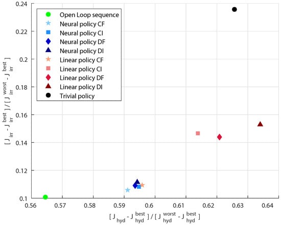 First of all, it is demonstrated that the neural approach provides a better performance than the linear ones. This may sound obvious, but in practice it sometimes happens that linear models, which are easier to identify since it is possible to find exactly the best parametrization, over-perform more complex nonlinear models. The advantage of using a nonlinear architecture instead of a linear one is substantial when only a few variables are given as input to the control rule. On the other hand, if lots of information is available (and thus more parameters can be optimized), the distance between the solution provided by the two models becomes less significant. In this work, we assumed to exactly know the value of all the variables composing the information vector. In fact, this is not always the case: it is possible to have a precise measure for lots of variables (e.g., storages, water demands) but there could also be some information that cannot be easily sampled and thus has to be estimated. Considering these situations, it could be extremely useful to use a neural policy, since we can save lot of time and resources that would have been otherwise needed.