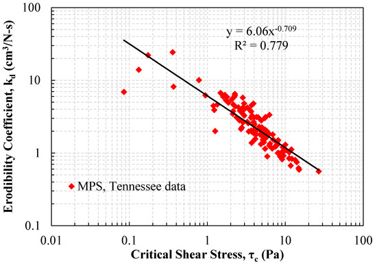 Among the 21 stream sites (126 jet tests), soil textures varied but generally were predominantly silty-loam and silty-clay-loam (Figure 1). Atterberg limit tests indicated the presence of cohesiveness in the soil samples since the PI values were between ~3 and 21. The LL and PL values were between 24% and 43%, and 17% and 31%, respectively. Some of the soil samples had a low PI (3.4–7.5), even though the material met the criteria for cohesive soils (minimum clay content of 5–10% by weight) as defined by Raudkivi [45] and Mitchell and Soga [46]. Bulk density of the tested soils was between 1.52 g·cm−3 and 2.12 g·cm−3, and the D50 value was between 3.7 µm and 40 µm. Soil cohesion ranged from 8.55 kPa to 107.90 kPa. Details of other physical and geochemical properties of these soil samples were summarized in Mahalder et al. [16]. The relationship between τc and kd from the MPS-BM for the jet device dataset among the 21 Tennessee sites showed an inverse power relationship (Figure 6). The linear relationship between τc and kd is consistent with others [4,8,14], however the MPS result in this study scales higher for the erodibility parameters.