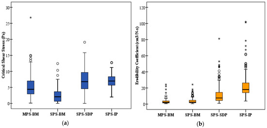 Mean τc using the MPS-BM method was 5.13 Pa, over twice the mean of 2.48 Pa from the SPS-BM method (Table 3, Figure 7a). Estimates of τc between the MPS-BM and SPS-BM methods were statistically different (p < 0.001, Mann-Whitney U test, SPSS- v.23.0). Mean kd was 3.26 cm3·N−1·s−1 using the MPS-BM method and 3.84 cm3·N−1·s−1 from the SPS-BM method (Figure 7b); they were not significantly different (p = 0.116). Similarly, τc estimates from the MPS-BM procedure also compared with the SPS-SDP and SPS-IP procedures (Figure 7a). The mean τc values using the MPS-BM method was found to be 5.13 Pa, and for the SPS-SDP and SPS-IP the mean values were found to be 6.88 Pa and 7.07 Pa, respectively. The median τc using the MPS-BM method was statistically different from both the SPS-SDP and SPS-IP procedures (p < 0.001). Estimated kd values were significantly less for both the MPS-BM and SPS-BM procedures compared with the SPS-SDP and SPS-IP procedures (Table 3; Figure 7b). This result identified a major anomaly using these solution approaches where kd values increased with increasing τc values, and was similarly reported by Karamigolbaghi et al. [32]. It is important to note that a wide range (about 1 to 3 orders of magnitude difference) in the estimated τc and kd values were observed among this dataset using different computational procedures.
