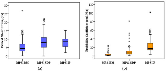 A comparison of (a) critical shear stress and (b) erodibility coefficient using the MPS method for the computational procedures: MPS-BM, MPS-SDP, and MPS-IP (as defined in Table 1).