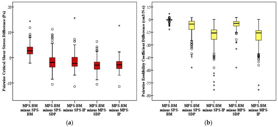 Pairwise differences between different solution techniques for: (a) critical shear stress (τc), and (b) erodibility coefficient (kd) estimations between: MPS-BM and SPS-BM; MPS-BM and SPS-SDP; MPS-BM and SPS-IP; MPS-BM and MPS-SDP; and MPS-BM and MPS-IP procedures.