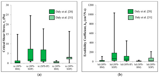 Comparison of (a) critical shear stress (τc) and (b) erodibility coefficient (kd) using the SPS-BM, SPS-SDP and SPS-IP methods based on data from Daly et al. [20,31].
