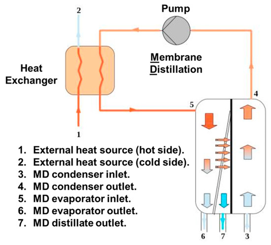 Figure 2 shows a sketch of the PGMD where feed water (flow 3) enters into the condenser, takes energy and then increments its temperature due to the heat transfer from the evaporator and distillate channels (flow 4). Feed water is then reheated by an external heat source by means of the HX Tank-MD (flows 1 and 2). Then, hot feed water enters the evaporator (flow 5) where some vapor is produced and the remaining liquid transfers the heat to the condenser side. Finally, vapor passes through the membrane and then it is condensed to obtain distillate (flow 7). The salinity of the remaining brine is then slightly increased (flow 6).