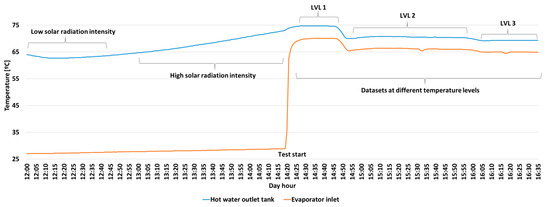 Figure 3 shows the behavior of the system during a solar test in July. At the beginning of the day, the tank temperature was about 65 °C and the heating process due to hysteresis started; the temperature of the tank increased as the sun radiation intensity increased. When the temperature in the hot water outlet zone reached about 75 °C, the MD test started. It can be seen that due to the tank stratification, a constant temperature can be maintained during tests. Due to the high energy rate of the MD evaporator, the tank temperature and therefore that of the evaporator inlet went down; nevertheless, it can be observed that the system operated at almost constant temperature levels. Datasets for different temperatures and mass flow rates feeding the MD unit were gathered in the test bench. A solar dataset was obtained in a campaign from May to October 2017. Table 1 shows the operating range of the variables used during the data collection.