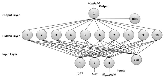 The definite structure of the selected ANN is shown in Figure 5. Measured inlet temperatures of the evaporator (Tei) and condenser (Tci) and seawater feed flow in the PGMD (mfeed) were used as the ANN inputs. The output of the ANN is the distillate produced (mdist). The developed ANN-based correlation will be then adopted to replace the existing linear regression correlation in the previous simulation presented in [7]. Regardless, the mathematical model of this ANN for this PGMD can be extrapolated to any other software.