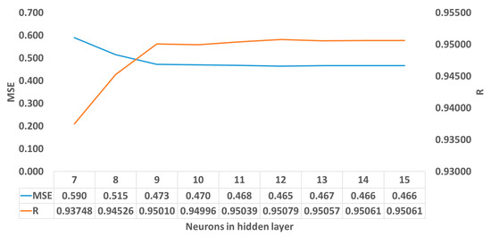 If the effect of the dataset size is neglected, the minimum number of neurons in the hidden layer is 7. Therefore, nine different ANN models were trained using inputs from the electrical and solar datasets, varying the number of neurons from 7 to 15. Figure 6 shows the parametric results of varying the number of neurons in the hidden layer.
