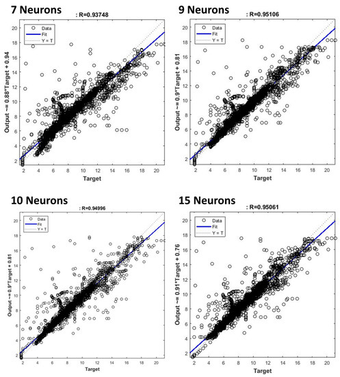In Figure 6, it can be seen that the MSE of the ANN model with 7 neurons is 25% higher than the case with 10 neurons and 26% higher than the case with 15 neurons. The MSE is decreased as the number of neurons is increased. However, it can be clearly observed that the difference among the models from 10 to 15 neurons is minimal, about 0.8%. The same trend can be observed with the coefficient of determination, R. The model with 7 neurons is 1.31% and 1.38% smaller than the cases with 10 and 15 neurons, respectively. The effect on the R value of the number of neurons in the hidden layer can be observed in Figure 7 for the case of 7, 9, 10 and 15 neurons. Once again, it can be seen that after 10 neurons, the performance of the ANN model remains at R values very close to a value of 0.95.
