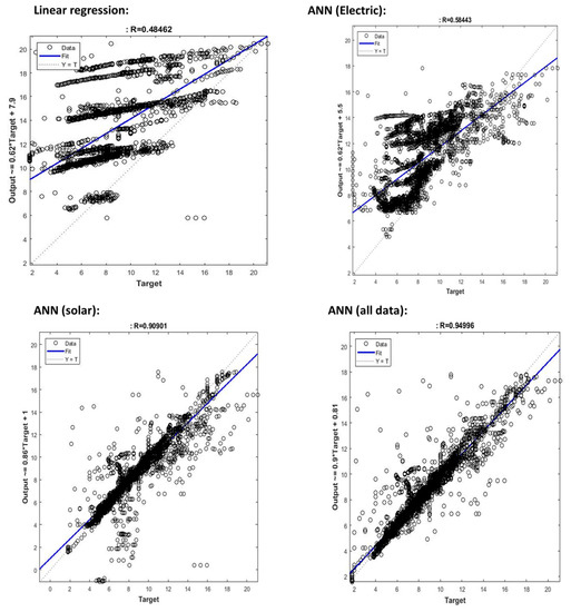 Finally, when all data were combined, the ANN model gave the most accurate results, with the lowest value of MSE (0.47) and highest R value (0.95) (Figure 8, bottom right-hand corner). Thus, this last set including the combined electric and solar test conditions was used for the definite ANN.