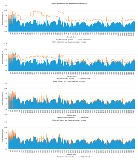 Alternatively, Figure 9 presents the global comparison of the 11,643 experimental samples of distillate produced in the PGMD module (in blue) with those predicted by the linear regression and by the ANN models (with three different data sets, in red).