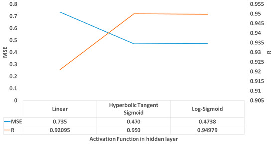 The back-propagation algorithm applied requires that the activation function has to be continuous and therefore derivable to obtain the error in the hidden and output neurons [47]. Here, three basic functions that comply with this condition are analyzed in the hidden layer: linear function and sigmoidal functions (log-sigmoid and Tanh). Figure 10 shows a comparison of the MSE and R performance with three different activation functions.