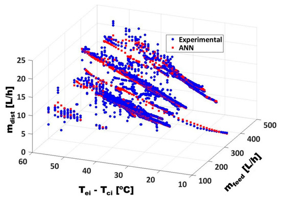 The 3-D view (Figure 11) of the experimental and predicted production of the PGMD shows that the definite ANN model obtained is flexible, adaptable and is not over fitted. The detail in Figure 11 shows that the ANN accurately predicts the PGMD distillate independently from the feed flow rate or temperature gap between the condenser and evaporator inlets. Thus, the model can adumbrate the production in the range from 200 L/h to 500 L/h and with a temperature difference band from 10 °C to 60 °C between the inlets of the evaporator and condenser for a feed seawater of 35 g/kg of salinity. Note that a few samples are only taken in the range from 10 °C to 30 °C and the band of 200 L/h since the MD performance was rather low (a very high specific thermal energy consumption was found), and the major number of tests were located in the range of 300 L/h, which allowed the pilot unit to maintain the inlet temperature drop in the range of 30–50 °C under any sunny condition during the solar tests.