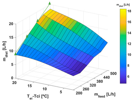 To reinforce that this ANN model is not over fitted, results from Winter et al. [13] were also introduced and compared in Figure 12, which shows the same results as those presented in Figure 11, but in a 3-D surface view. The variation of the temperature difference (Tei − Tci) was constrained from 35 °C to 55 °C (with a step of 1 °C and 20 L/h). Note that in the reference the abovementioned temperature difference was maintained at 55 °C (80 °C in evaporator inlet and 25 °C in condenser inlet) in the tests. Although some deviations were found (green line), the ANN model predicts the PGMD production with rather good accuracy, especially in the range from 200 L/h to 400 L/h for that energy supply. Furthermore, the ANN model could enlarge the predictions within a wider range of temperature drops and mass flow rates, corresponding to the typical operation of a PGMD only supplied by solar energy.