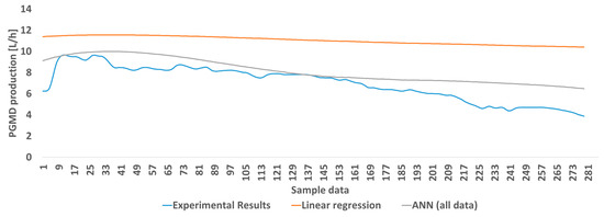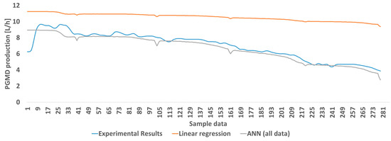 It can be seen that the linear regression presented in previous investigations is not very accurate; however, it gave us a first approximation to estimate the PGMD production under real conditions (Figure 8, top left-hand corner). Alternatively, the ANN model fed by only electric data tests did not strongly improved the linear regression, since its MSE decreased from 30.61 to 10.45 and the R increased from 0.48 to 0.58 (Figure 8, top right-hand corner). Table 3 shows some typical inlet and outlet parameters of some selected samples from the electric dataset at different temperature levels as described in Section 2.3.