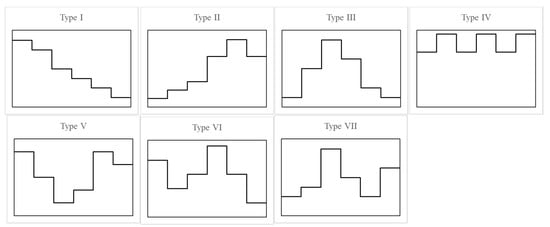 In this study, rainfall events were divided into six equal periods, and the mode matrices of the seven hyetographs are defined as: